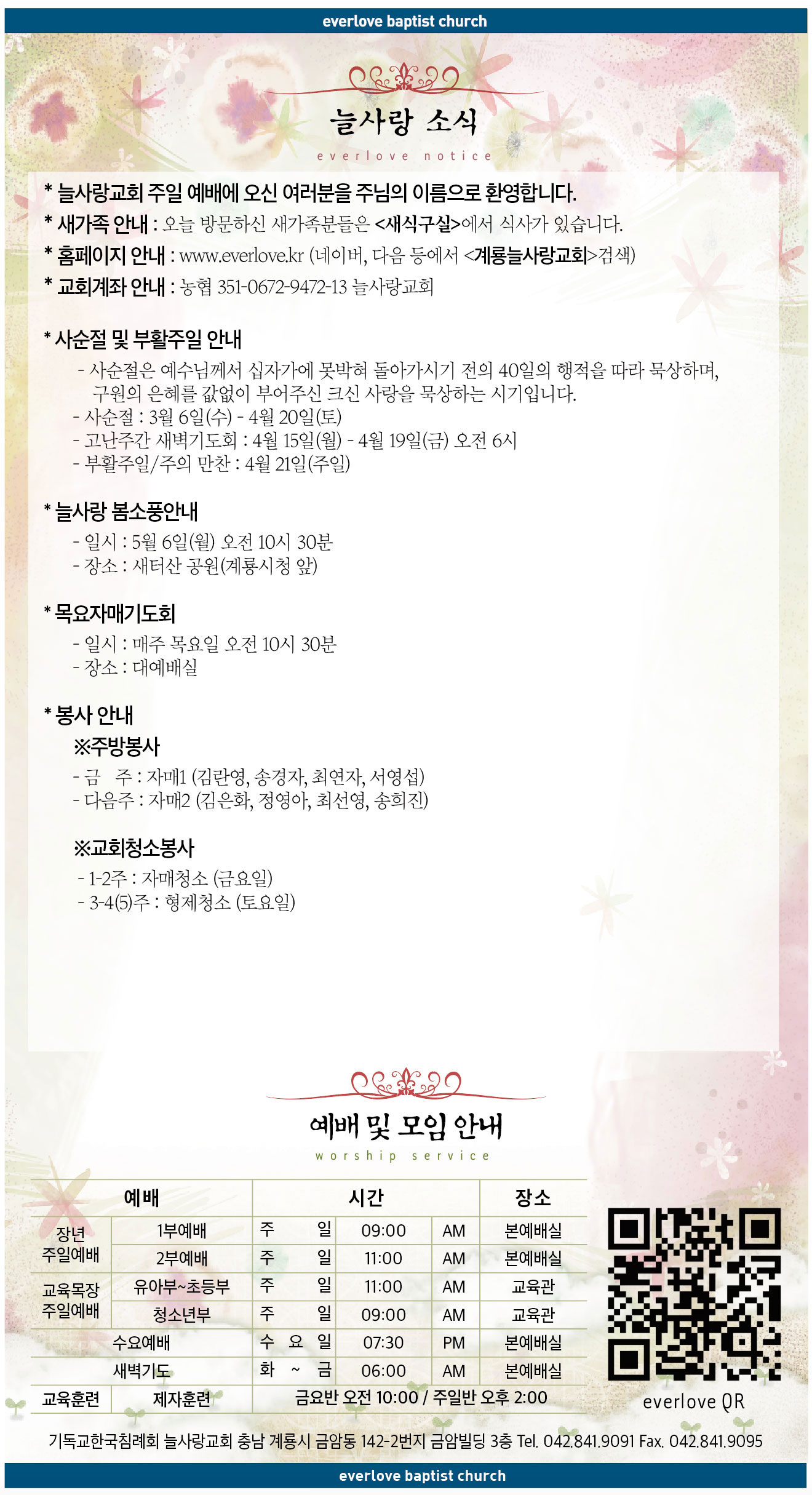 말씀이 삶이되는 늘사랑교회 늘사랑의 다양한 소식들을 전해 드립니다. 예배 순서와 말씀 본문도 보실 수 있습니다. 진행되는 사역들을 위해 함께 기도해 주세요. Tags:2019계룡교회교회소식늘사랑봄소풍부활주일사순절자매기도회