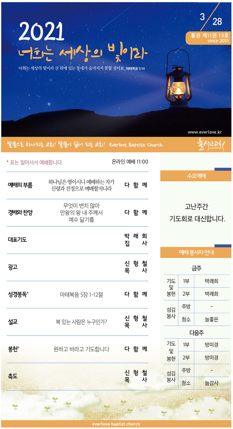 말씀이 삶이되는 늘사랑교회 늘사랑의 다양한 소식들을 전해 드립니다. 예배 순서와 말씀 본문도 보실 수 있습니다. 진행되는 사역들을 위해 함께 기도해 주세요. Tags:2021계룡고난주간교회모임교회소식늘사랑교회돌;보아만왕의 왕 내 주께서무엇이 변치않아방역수칙변경안내부활주일사역협의회새벽기도회예배시간예배안내예수 닮기를원하고 바라고 기도합니다