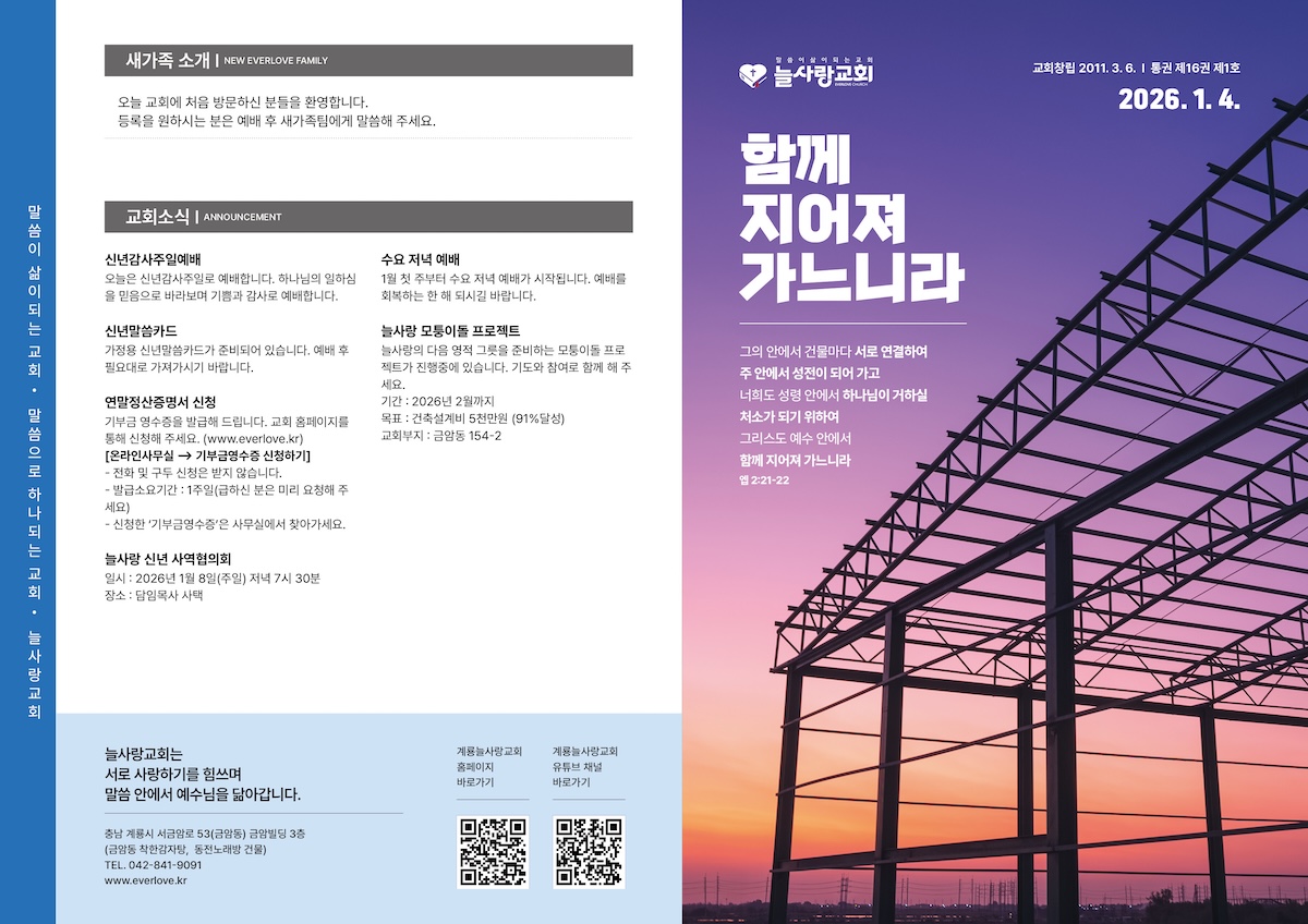늘사랑의 다양한 소식들을 전해 드립니다. 예배 순서와 말씀 본문도 보실 수 있습니다. 진행되는 사역들을 위해 함께 기도해 주세요.